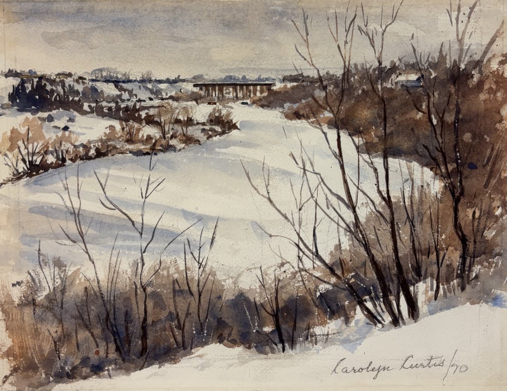 Born in 1903 in St. Thomas, Ontario, Carolyn Curtis showed a passion for drawing from a young age. After graduating from Alma College in 1924, she pursued Commercial Art at the Ontario College of Art in Toronto, where she studied under members of the Group of Seven, including J.E.H. MacDonald, Arthur Lismer, and Frederick Varley. In the 1940s, she began working in linocuts and etching, eventually joining the Society of Canadian Painter-Etchers and Engravers in 1944. A turning point came in 1945 when she took up watercolours, a medium that became her lifelong passion.