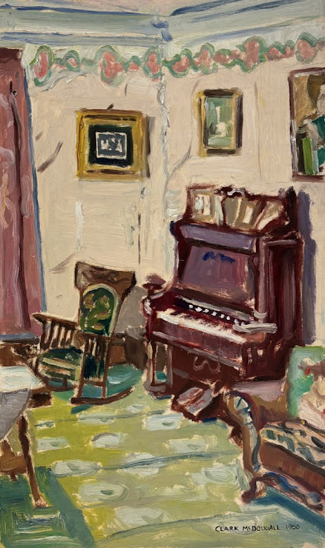 Born in St. Thomas, Ontario, the son of Mr. & Mrs. Alex McDougall, he followed his own self teaching plan from the age of twelve. He attended the St. Thomas Collegiate and the Voaden Vocational School. During the war, he was held back from entering the armed forces on medical grounds. He worked in the war industry outside St. Thomas and in his spare time sketched in the country. He took some lessons in oil painting from Mrs. MacGillivray Knowles. In Toronto, where he later did war work, he met Manly MacDonald and received valuable criticism from him. When he was ready to exhibit, most of his work had been done in water colours and one gallery turned him away because water colours were not as popular as oils. But at the Mellors Gallery his work was received with enthusiasm and his first one-man show took place there in January of 1944. It was an overwhelming success. Subsequently, he held other one-man shows in Toronto and also in New York City (1945, 1947); London Art Museum (1954); 20-20 Gallery, London, Ont. (1968) and a retrospective show at the Art Gallery of St. Thomas and Elgin, St. Thomas, Ontario. At the latter gallery, his work was shown for the period from 1939 to 1972 and was described by the St. Thomas Times-Journal as follows, “The bulk of McDougall’s art is concerned with rural landscapes and scenes, although he has done some cityscapes and portraits…ranges from traditional to almost photographic realism to abstract…For while his methods and styles may have changed over the years, one thing has remained refreshingly and obviously static – the artist’s love and zest for his vocation and the outdoors he has chosen for his area of concentration…His innovative technique with black enamel and oils, and his use of vivid Fauve colors are the qualities which typify his work (now)….Gradually, he moved towards a technique which has come to characterize his work – the bold, dramatic black outlines which serve as grid or understructure, webbing a painting together and emphasizing its discrete parts with much the same effect as the metal in a stained-glass window.”