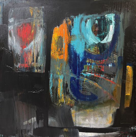 Jane Roy and Jamie Jardine are 2 local artists that meet each week over coffee to paint together. It is about the process of painting and the interplay between 2 artists. The collaborative works showcase what happens when two artists come together and produce something completely unplanned, as each artist takes separate turns to apply or remove paint, it poses a challenge to the other artist. This is usually done in a very relaxed, playful manner and provides a respite from each of their own work and studio time.